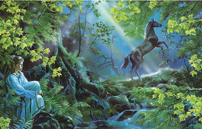 S puzzle Černý žrebec strong> si prídu na svoje ako milovníci romantiky, tak koní. Na obrázku je zobrazená dievča vo svetle modrých šatách sediaci v hustom lese, ako pozoruje divokého čierneho žrebca, ktorý nerušene dovádza v lesnom potôčiku. P>